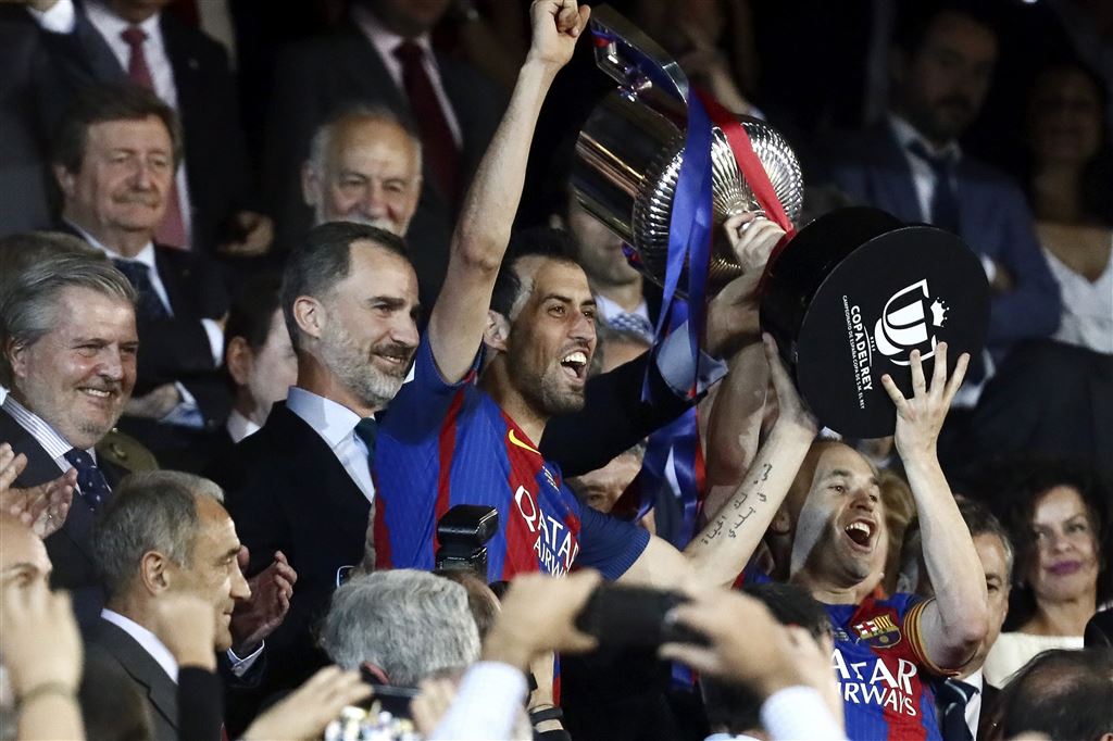 Felipe reikte de beker uit aan de aanvoerders van FC Barcelona, Andrés Iniesta en Sergio Busquets. De spelers van Deportivo Alavés kregen door hun koning een medaille omgehangen.