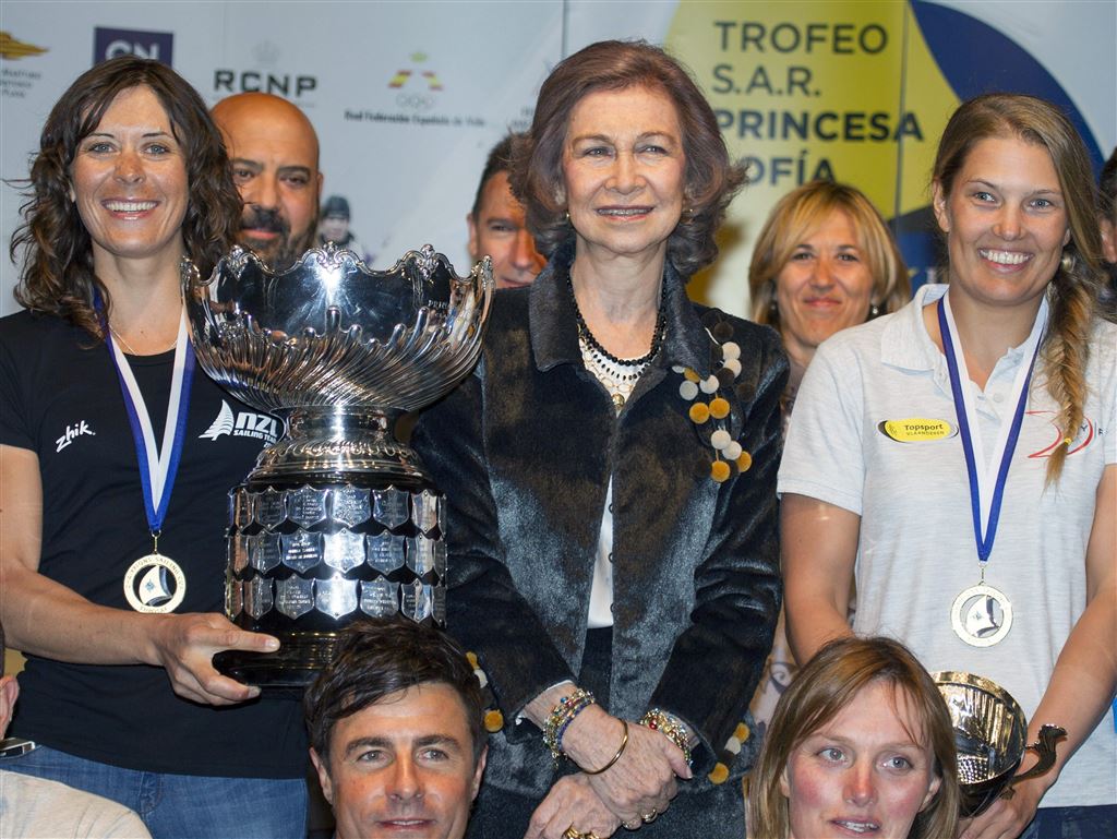 PALMA DE MALLORCA – Koningin Sofía van Spanje is op Mallorca. Ze zette daar zaterdagavond de Nieuw-Zeelandse zeilsters Jo Aleh en Polly Powrie in het zonnetje, de winnaars van de Prinses Sofía Trofee in de 470-klasse.