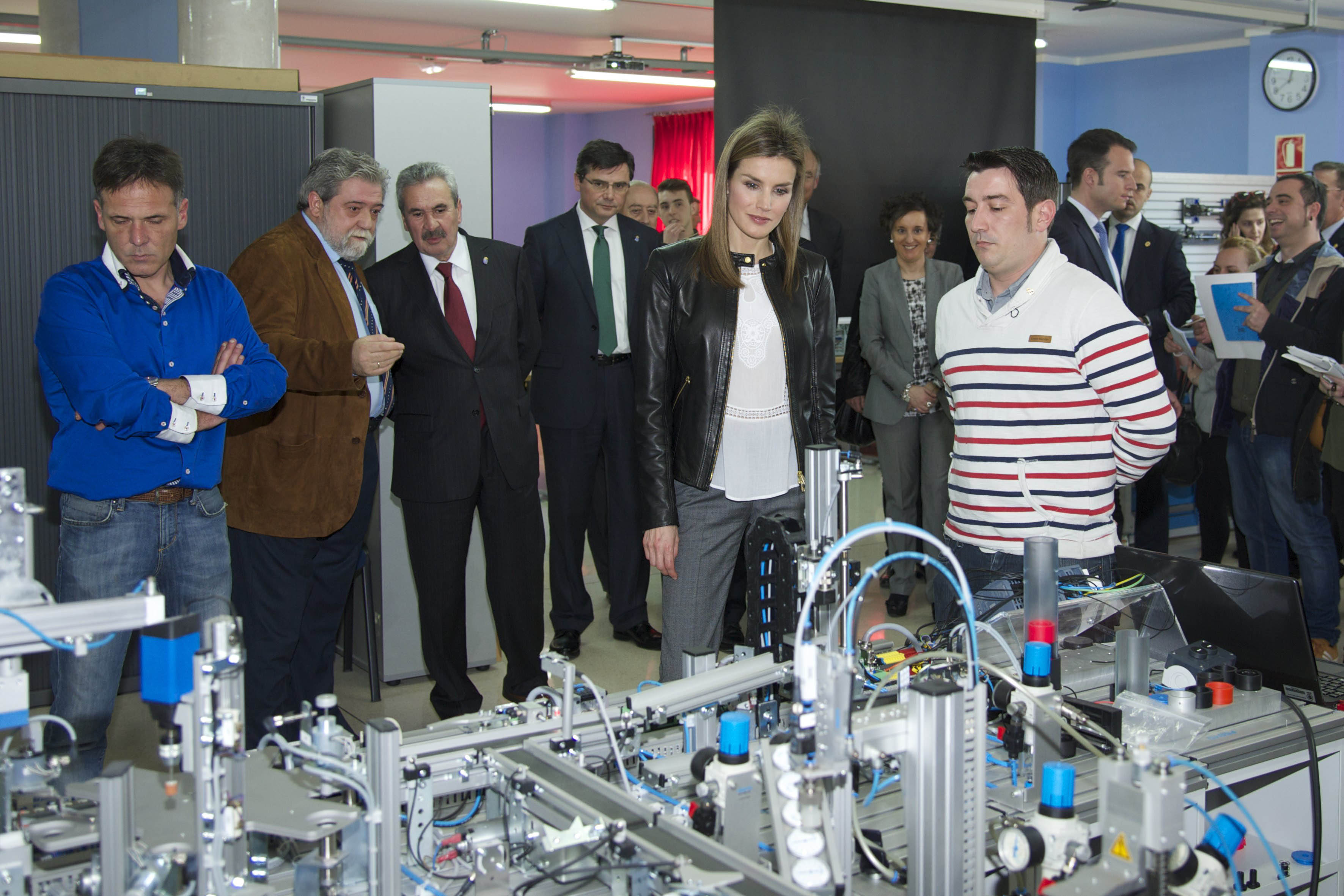 Prinses Letizia van Spanje pakt tijdens koninklijke feesten altijd goed uit met galajurken en juwelen, maar kiest tijdens werkbezoeken vaak voor relatief sobere kleding. Zo verscheen zij tijdens het bezoek aan een trainingscentrum in Langreo in een leren jasje, gecombineerd met een grijze broek en een witte blouse. Tussen de andere aanwezigen viel de prinses vrijwel niet op, waardoor het bijna een zoektocht werd om de prinses te ontdekken op de foto’s. Wat vindt u van Letizia’s keuze voor onopvallende kleding tijdens werkbezoeken?