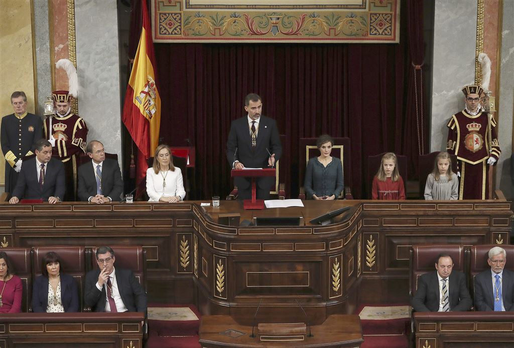 Volgens de Spaanse grondwet kan pas daarna de vierjarige zittingsperiode van het 22e parlement door de koning worden geopend. In zijn rede sprak Felipe over de diversiteit en eenheid van Spanje en respect voor de instituties van de staat, veroordeelde hij corruptie – pikant, gezien het proces tegen zijn zwager en jongste zus – en over de economische problemen van Spanje.