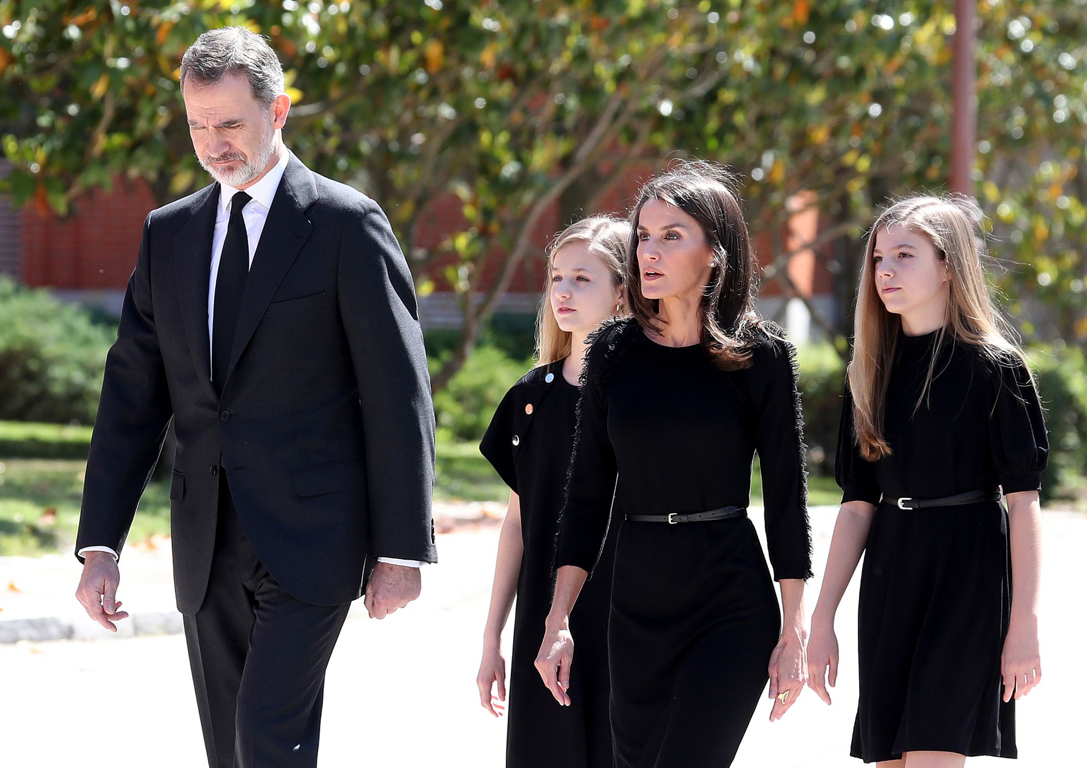 Koning Felipe, koningin Letizia en hun dochters Leonor en Sofia – allen in het zwart gekleed – kwamen even voor het middaguur naar buiten, waar zich medewerkers van het paleis al hadden opgesteld voor de korte plechtigheid.