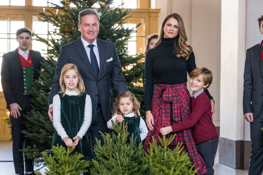 Het is geen officiële kerstkaartfoto, maar je kunt de dennennaalden bijna ruiken! Traditiegetrouw brachten een groep Zweedse studenten hun kerstbomen naar het Koninklijk Paleis en dit jaar was het aan prinses Madeleine en haar gezin om de bomen in ontvangst te nemen. De prinses woont met haar man Chris en kinderen Nicolas, Leonore en Adrienne in de VS en is nu bij haar familie in Zweden.