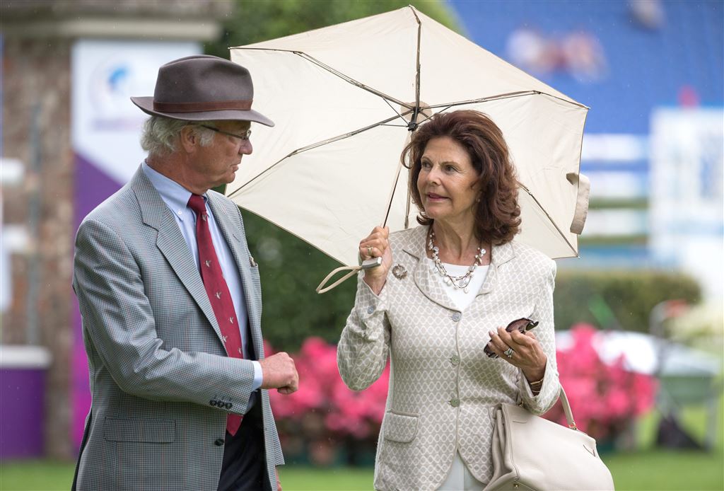 De regen was spelbreker dinsdagavond bij de openingsceremonie van het CHIO in Aken, ook wel het Wimbledon van de paardensport genoemd. Koningin Silvia en koning Carl Gustaf hadden een grote paraplu nodig toen ze in een open koets uit de Zweedse koninklijke stallen een ereronde maakten over het wedstrijdterrein in Aken Soers.