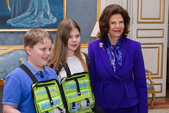 De Zweedse koningin Silvia heeft vrijdag de eerste ‘meibloem’ gekocht. Ze kreeg het speldje uit handen van de kinderen Axel en Ella uit Solskiftesskolan.