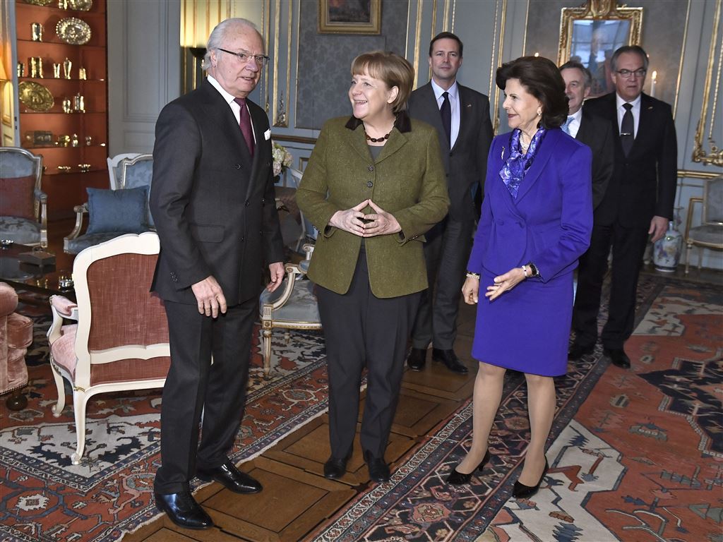Het Zweedse koningspaar heeft dinsdag een ontmoeting gehad met de Duitse bondskanselier Angela Merkel. Die was voor een eendaags bezoek in Zweden. Koning Carl Gustaf en koningin Silvia ontvingen Merkel in het Koninklijk Paleis.