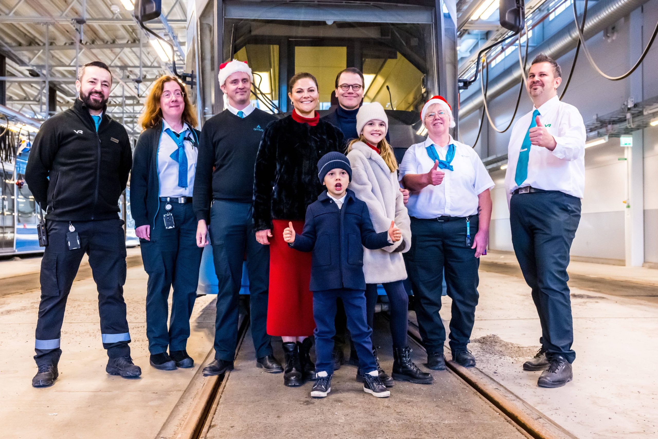 Kroonprinses Victoria, haar man prins Daniël en hun kinderen, prinses Estelle en prins Oscar, poseren met het personeel voor onder meer een van de trams. Ook mocht het gezin een kijkje nemen in de cabine.